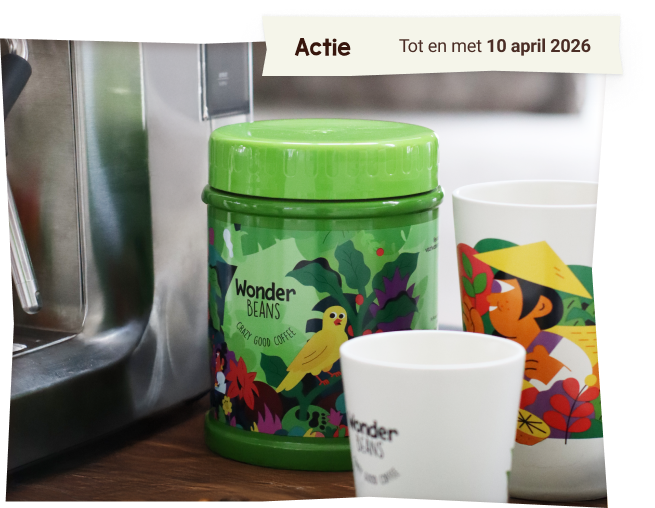 Sluit nu een abonnement af op koffiebonen of koffiecups en ontvang een GRATIS bewaarblik van HEDOF (t.v.w. € 19,95). De wereldbekende en Nederlandse kunstenaar HEDOF is bekend van zijn vrolijke, maar impactvolle illustraties. Voor Wonder Beans maakte HEDOF een waar kunststuk voor op jouw aanrecht. Deze past niet door je brievenbus, maar je ontvangt hem wel.