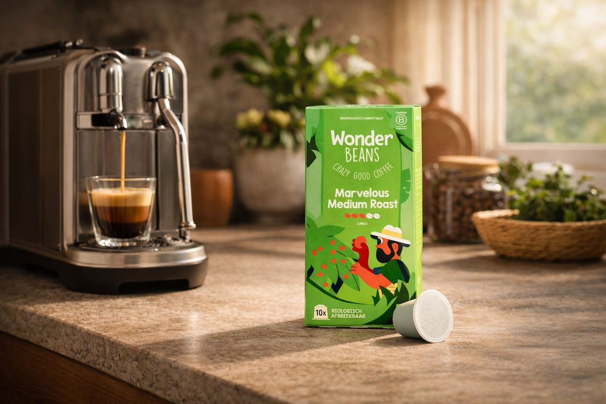 De Marvelous Medium Roast is een heerlijke blend, bestaande uit 100% biologische Arabica-koffie, wordt met veel zorg en liefde geproduceerd door boeren op onze Wonder Farms in onder andere Oeganda en Peru. Deze koffiecups zijn 100% biologisch afbreekbaar. De cups zelf zijn gemaakt van 100% hernieuwbare grondstoffen; van planten. Volgens de officiële certificeringsorganisatie TUV Austria zijn de cups dan ook zowel industrieel- als thuis composteerbaar. Met de Marvelous Medium Roast kun je heerlijk hebzuchtvrij genieten van een zorgeloos en smaakvol koffiemoment. Onze koffiecups passen in alle Nespresso® orginal geschikte machines. Dus niet in de Nespresso® Vertuo of Nespresso® professional. Dit betekent dat onze capsules in de meest gangbare Nespresso ® thuismachine werken.
