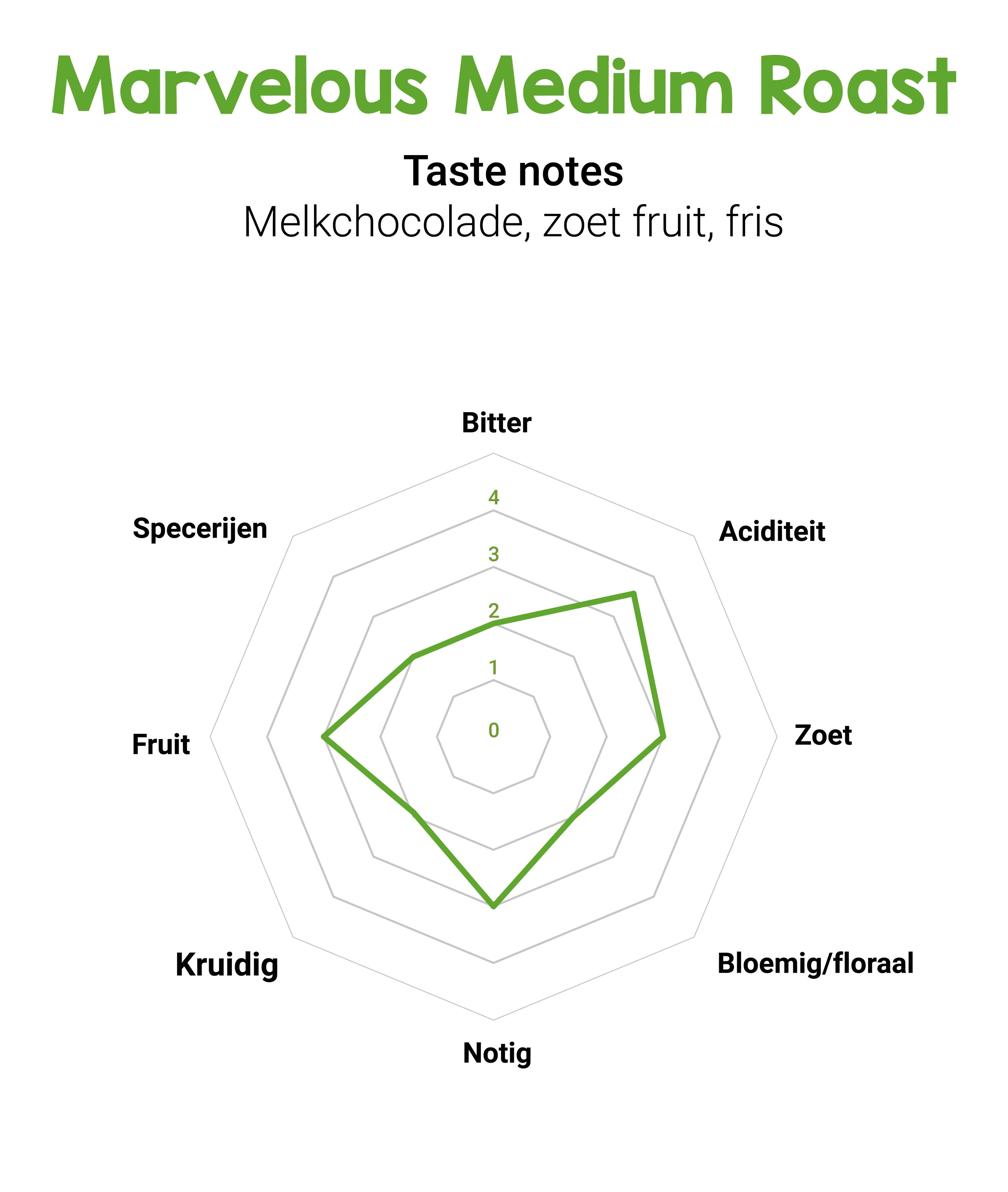 De Marvelous Medium Roast biedt een perfecte balans tussen toegankelijkheid en verfijning. De koffie smaakt naar een heerlijke combinatie van melkchocolade en zoet fruit, met een verfrissende ondertoon van rijpe limoen.