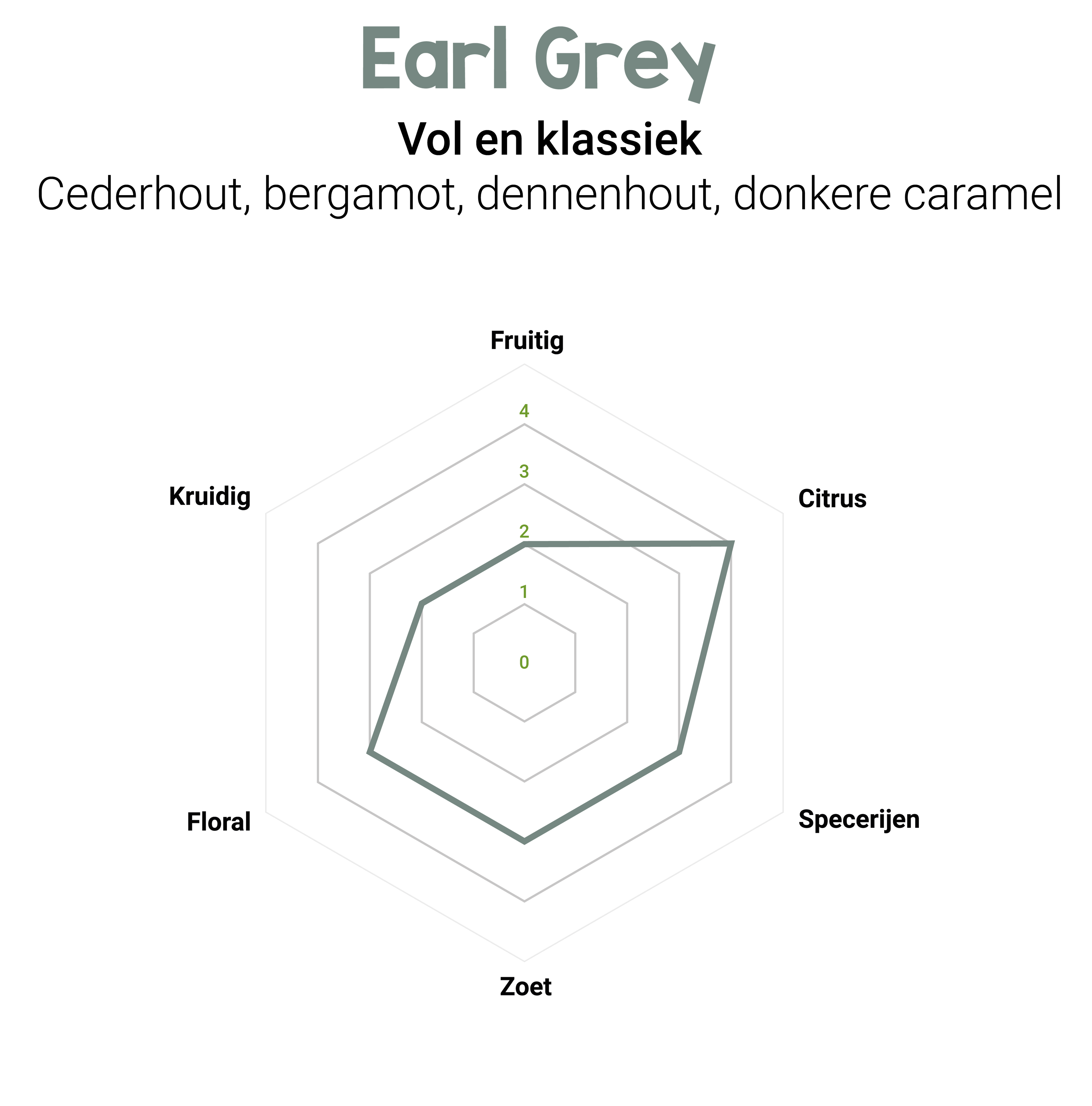 Earl Grey is gemaakt van de hoogste kwaliteit theeblaadjes, met de hand geplukt en verrijkt met een vleugje verfrissende citroen en bergamot. Deze thee is een echte volle, klassieke thee waar je eindeloos van kunt blijven genieten. In deze thee proef je onder andere cederhout, bergamot, dennenhout, caramel.